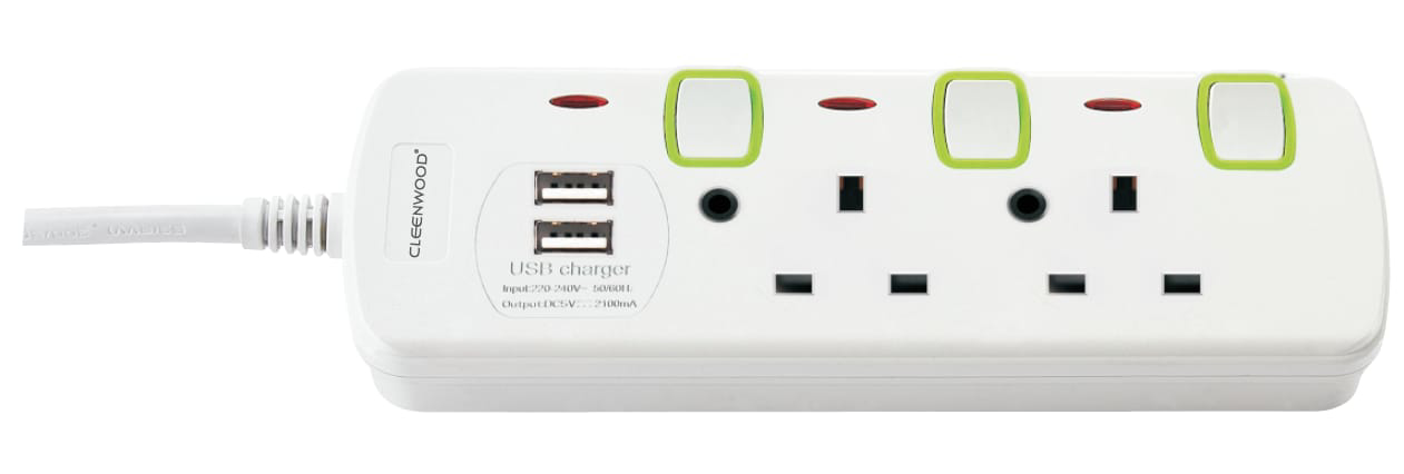 This Power extension comes with 2-way individual switches with safety shutters preventing short circuit. It comes with two 2.1A USB ports. It also has a fire resistant cable that is 4 meters long.
