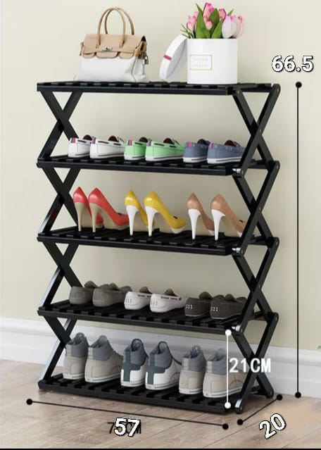 5 Layer Shoes Organizer Storage Stand with Non-Woven Fabric, Firm Stainless Steel, Waterproof, and Dust-Proof. Portable and simple to install. Simple to move and maintain. Non-Weaved Material. The materials are non-woven fabric, SS, and PP. Dimensions are 57 x 20 x 65.5 cm.
