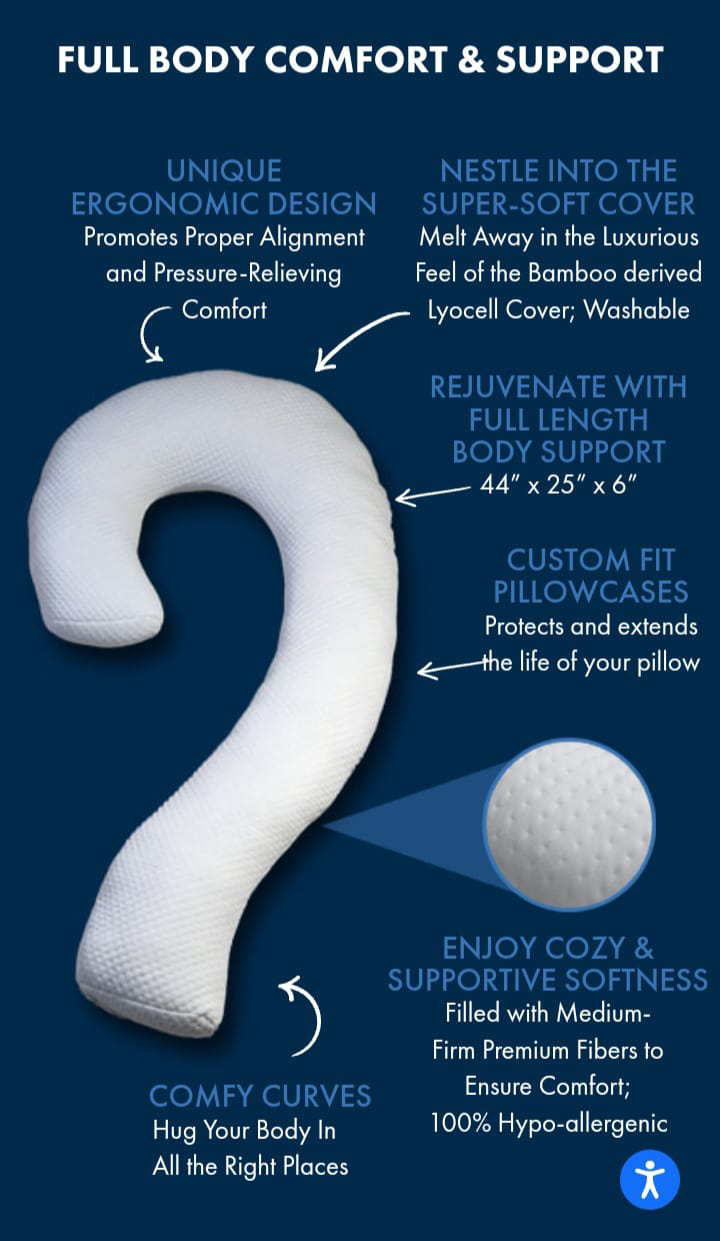 Comfortable Ergonomic 7-in-1 Pillow aids in spine alignment for pressure and complete body support. The soothing, long-lasting comfort offered by Micro-Coil Fiber Technology progressively expands to give cradling support. The patented, ergonomic tapered design fits your body like a glove, offering support and comfort without adding bulk.